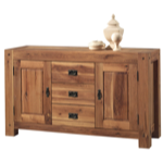 Bahut en chêne huilé avec trois portes et trois tiroirs sur rail métal pour une ouverture totale et une optimisation de l’espace.