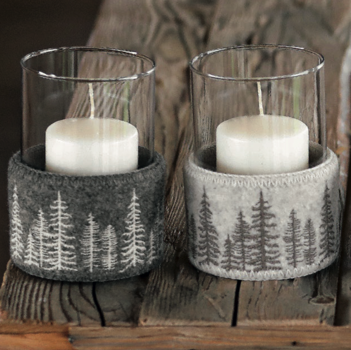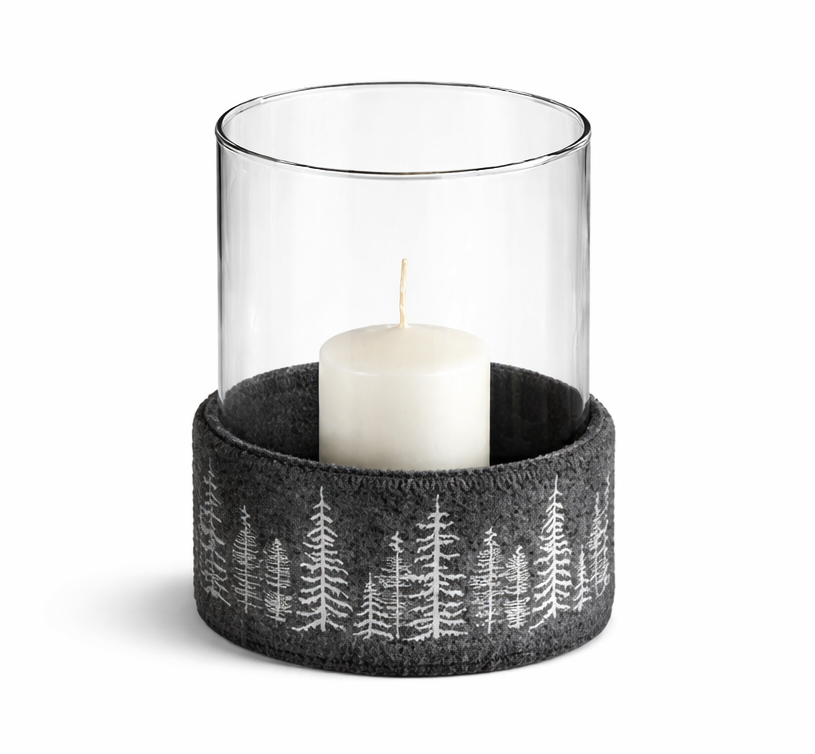 Entouré de feutre de laine naturelle taupe ornée de sapins, il apportera une discrète touche chic et distinguée.