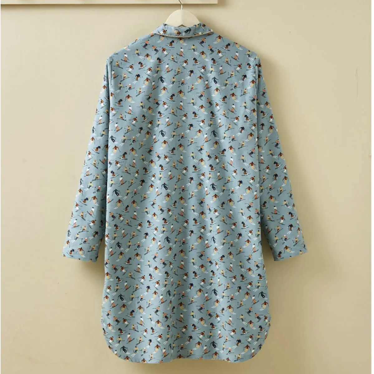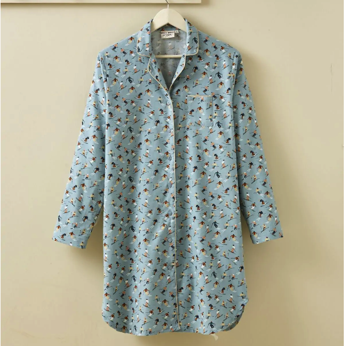 Sur cette chemise de nuit femme en flanelle douce et chaude, les silhouettes de skieurs dévalent les pentes dans un motif graphique inspiré des croquis rapides des illustrateurs.