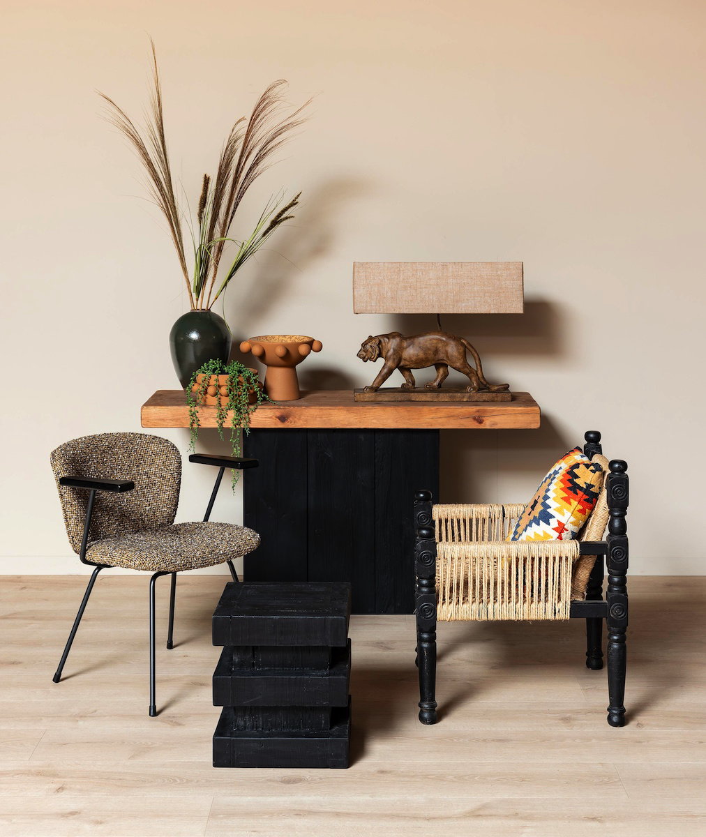 Elle illustre l'engagement envers une décoration responsable et durable. Le pin recyclé révèle son caractère unique à travers ses veines naturelles et ses nœuds apparents, faisant de chaque pièce une création authentique. La base géométrique noire offre une stabilité exemplaire tout en apportant une touche d'élégance minimaliste.