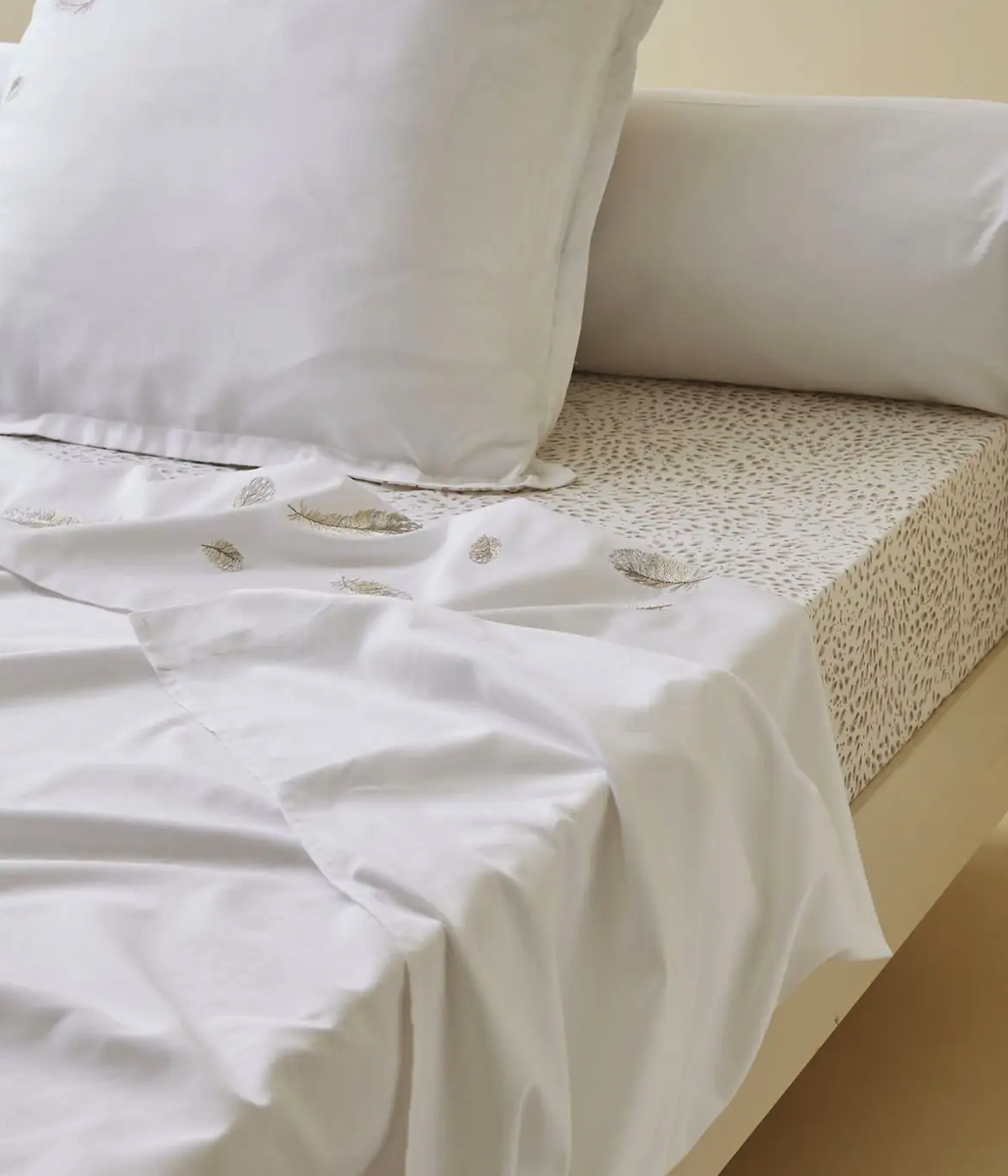 Avec son allure aérienne, le drap brodé invite à des nuits paisibles, où le raffinement du satin et la délicatesse des plumes s'unissent pour une expérience de sommeil enveloppante et luxueuse.