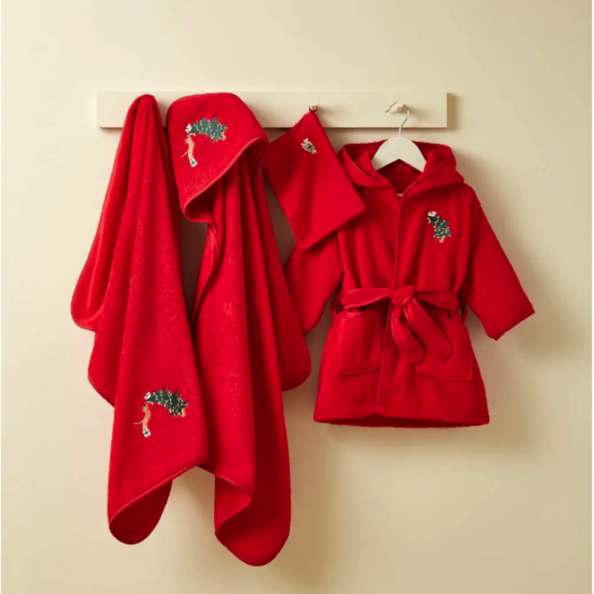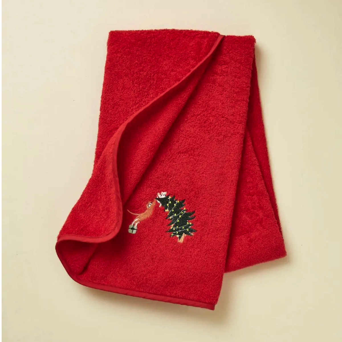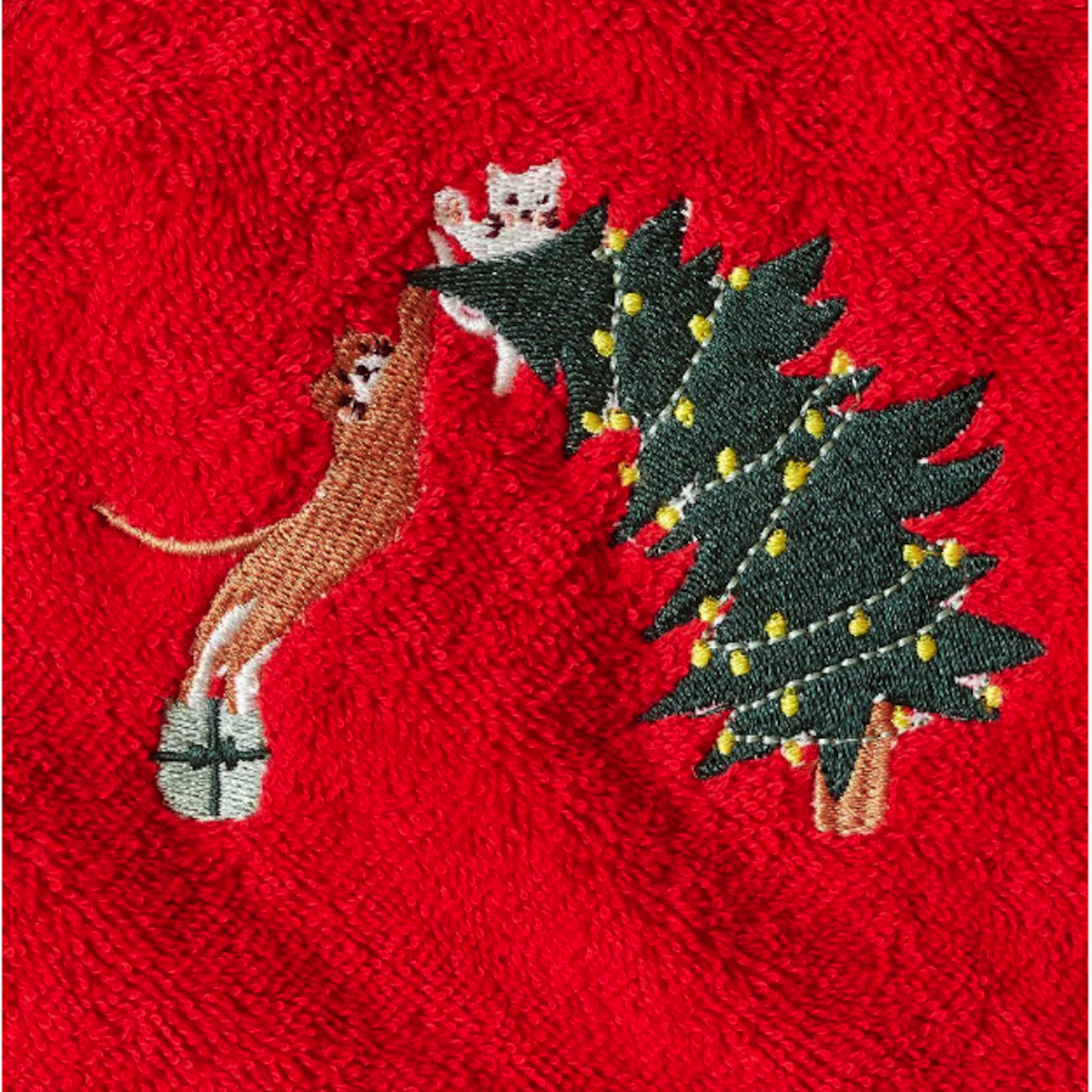 Disponible en un doux coloris rouge, ce drap de bain est ornée d'une broderie délicate de chat et de sapin, apportant une touche ludique et festive à la parure.