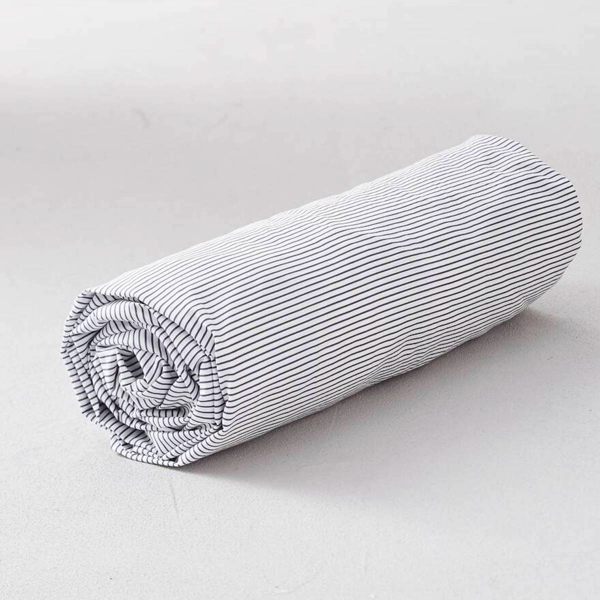 Drap housse en percale de coton imprimé fines rayures bleues marine et mascarpone.