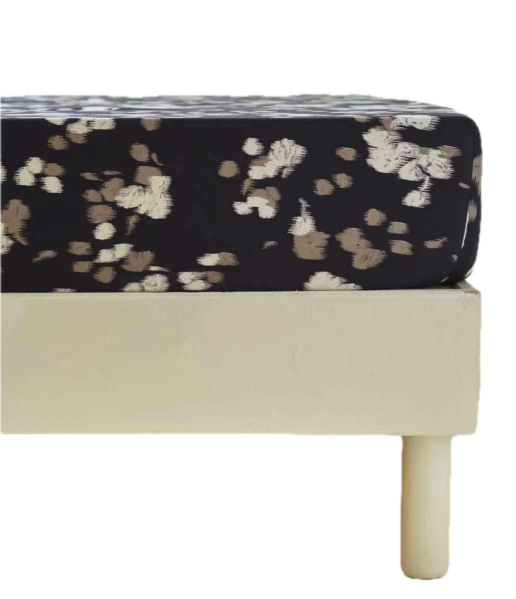 Ce drap housse modernise le motif floral grâce à un effet estompé qui le transforme en un dessin proche de l’abstraction et libre d’interprétation. Certains y verront des nuages, d’autres les taches d’un animal exotique, d’autres enfin les lumières dans la nuit.