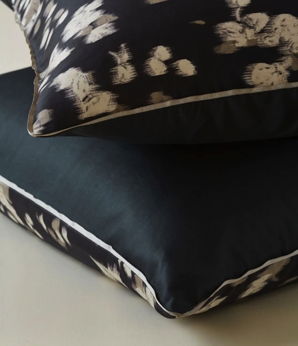 Imprimé sur un élégant satin de coton noir, il est accompagné d’un délicat passepoil de reps.