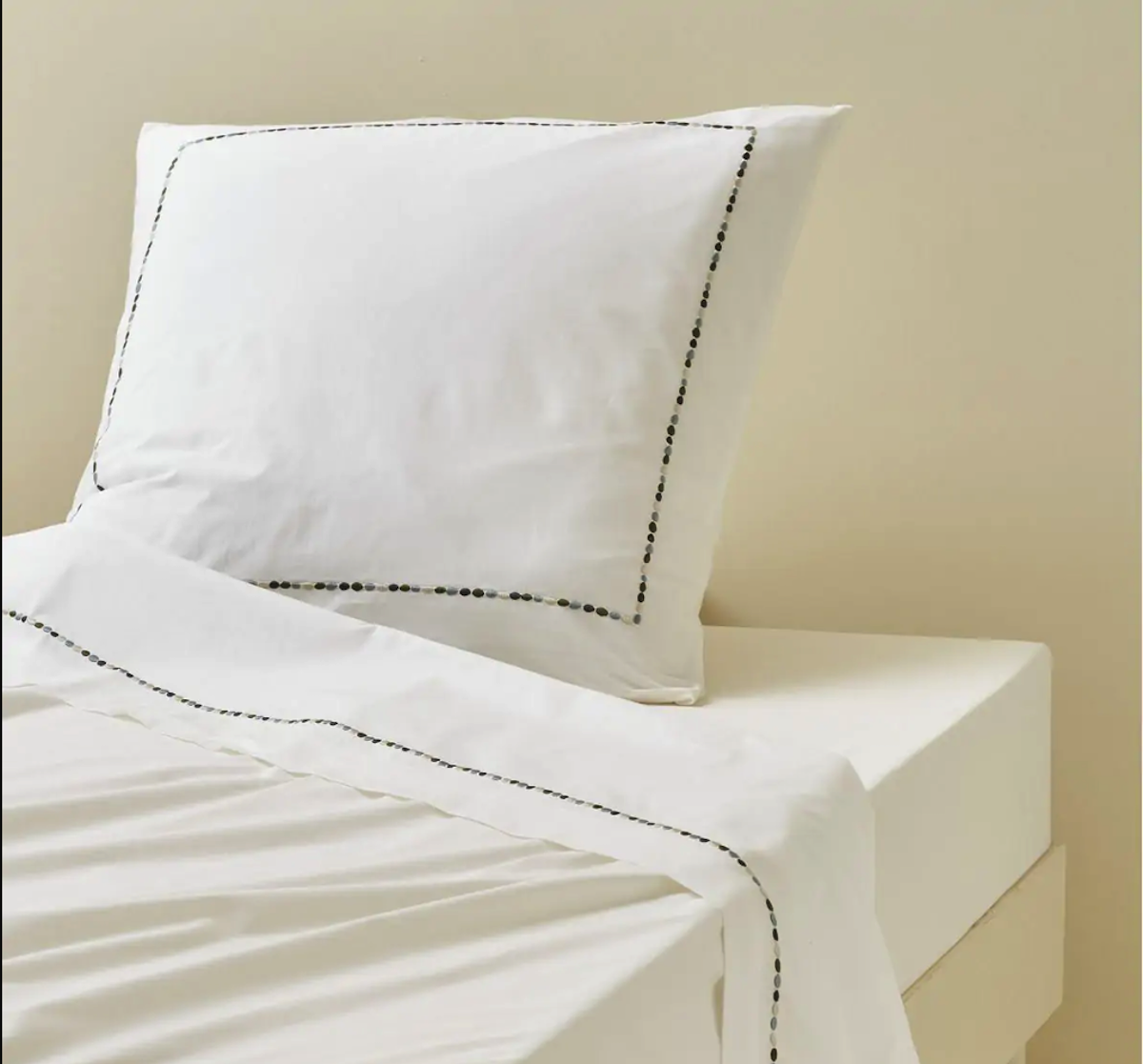 Sur ce drap plat 240x310 cm en percale de coton, les lignes de pois sont brodées avec délicatesse et déclinent des camaïeux de couleurs actuelles et faciles à assortir.
