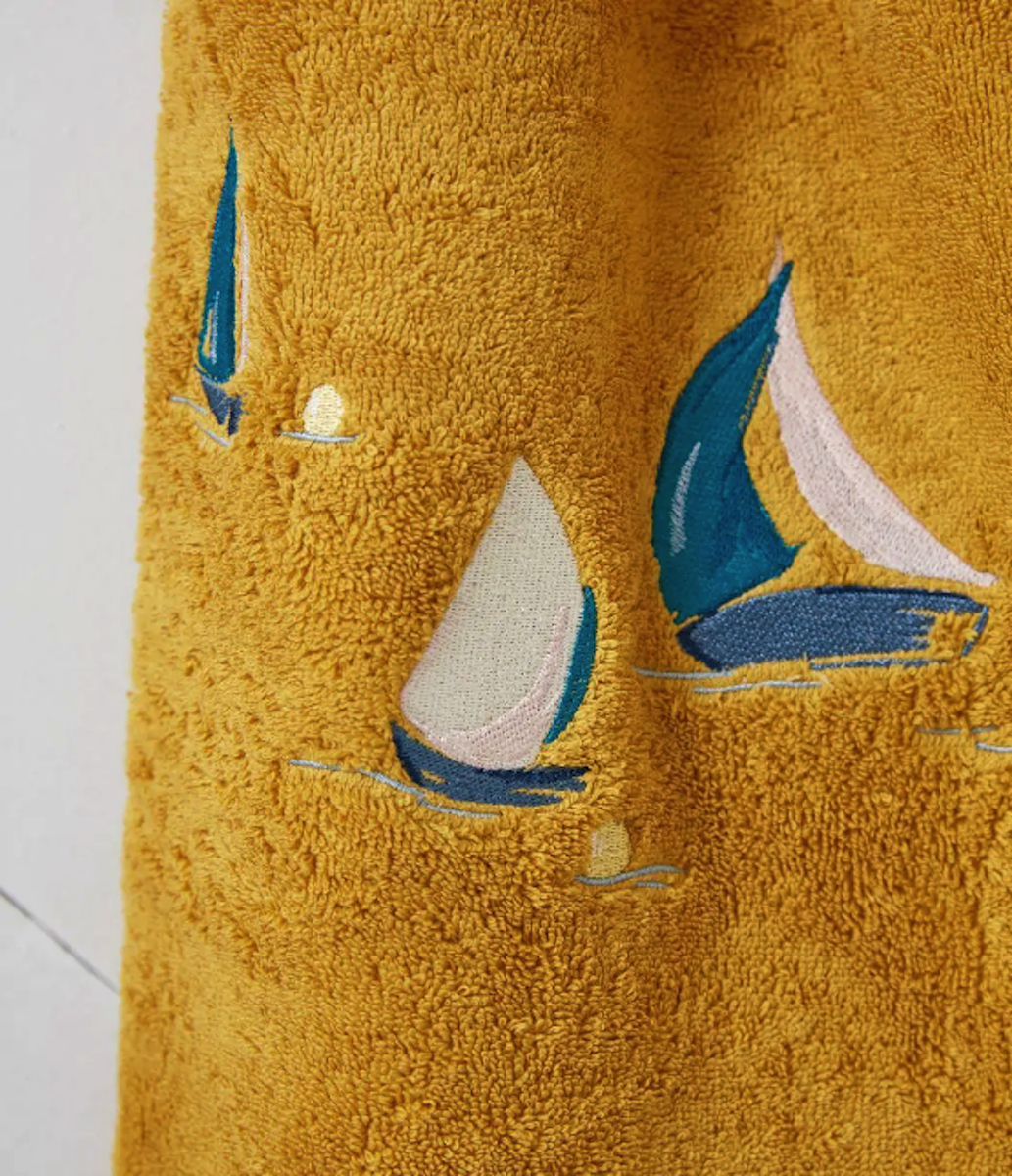Le linge de bain Au Large – Miel invite l'esprit marin dans votre salle de bain. Confectionné en coton 550 g/m², il allie une épaisseur généreuse et une texture moelleuse à une broderie délicate inspirée du vent, des vagues et du soleil. Disponible en plusieurs formats pour composer une parure de bain complète et cohérente.