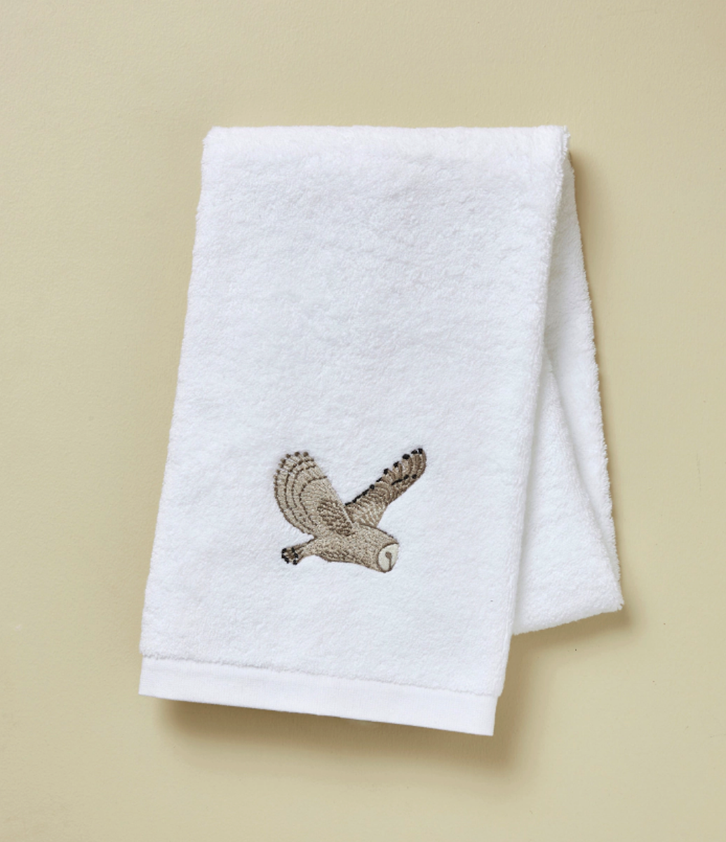 Savourez la fraîcheur des matins d’hiver en vous enveloppant dans ce linge de bain en éponge douce, brodé d’élégantes chouettes effraies aux teintes beiges et écru.