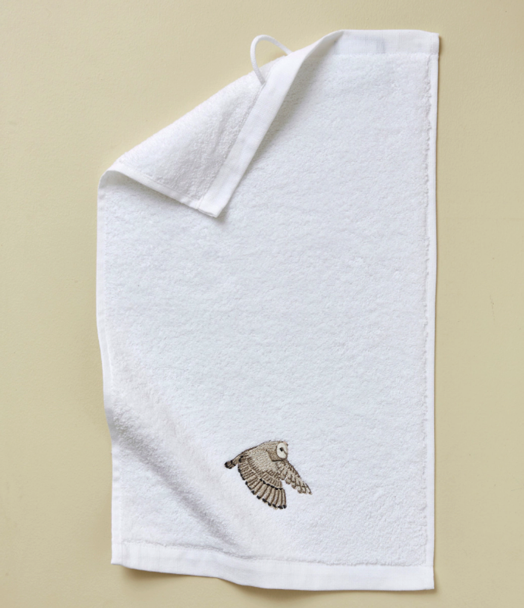 Savourez la fraîcheur des matins d’hiver en vous enveloppant dans ce linge de bain en éponge douce, brodé d’élégantes chouettes effraies aux teintes beiges et écru.