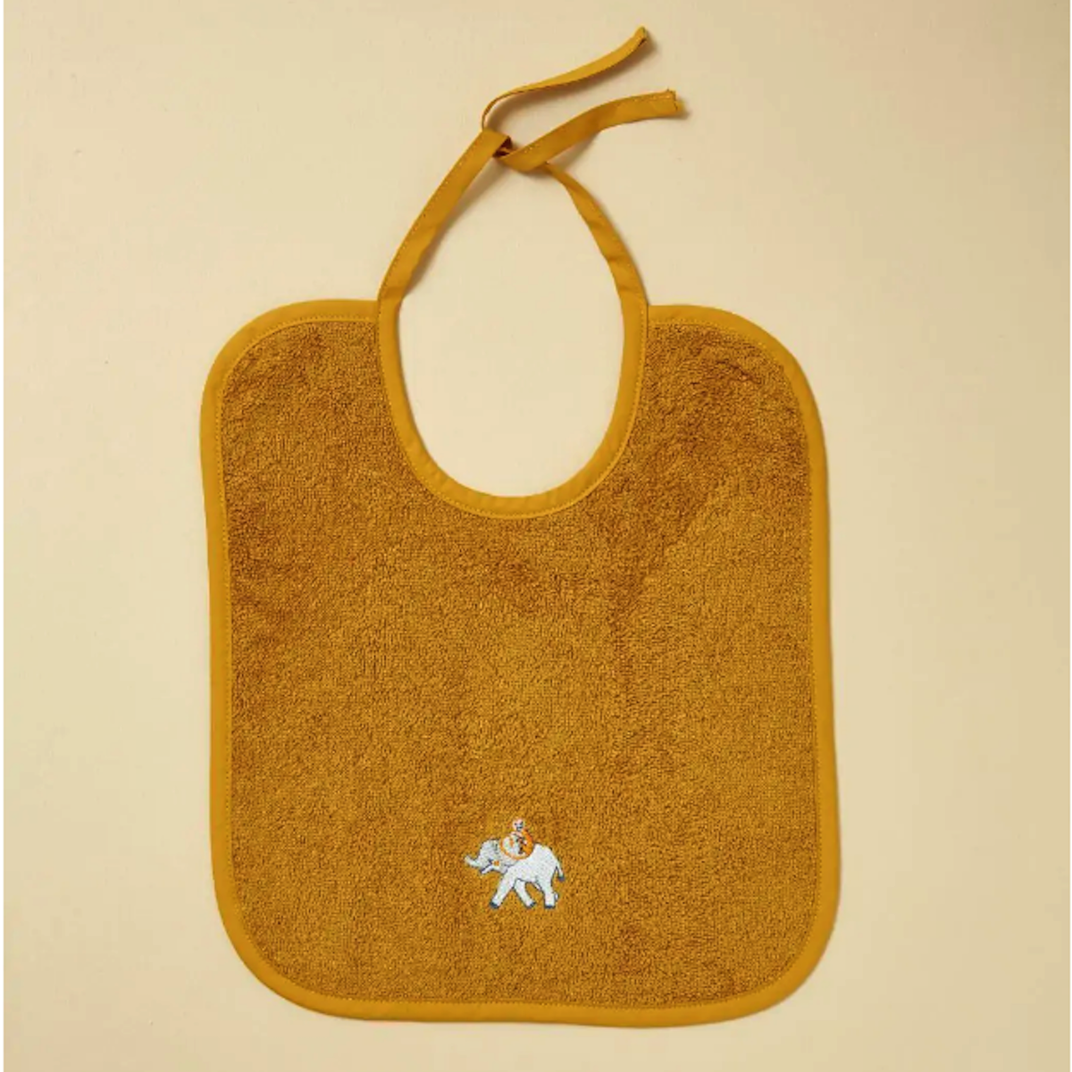 Disponible en un doux coloris safran, ce gant de toilette est ornée d'une broderie délicate d'éléphants, apportant une touche ludique et apaisante à la parure.