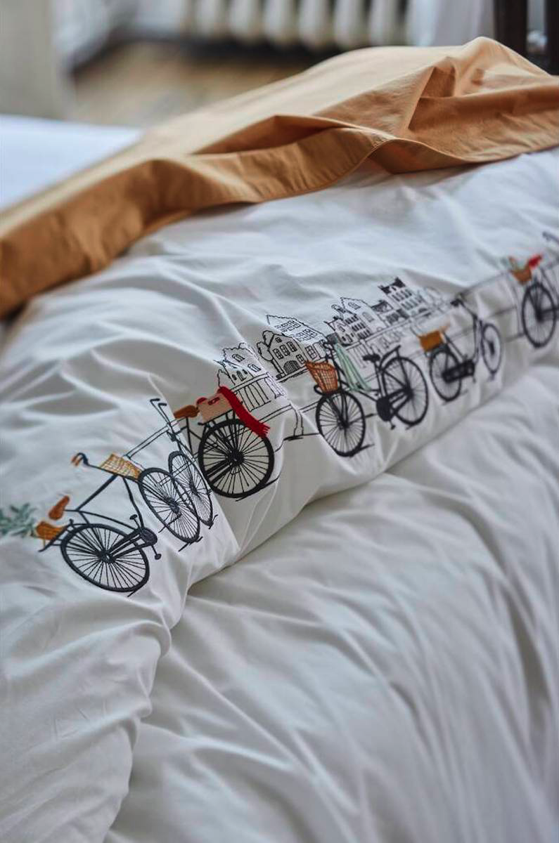 Brodé avec un fil bleu marine sur un fond mascarpone, le paysage est rythmé de quelques touches de couleurs qui apportent une note de bonne humeur et qui permettent une association facile avec les unis.