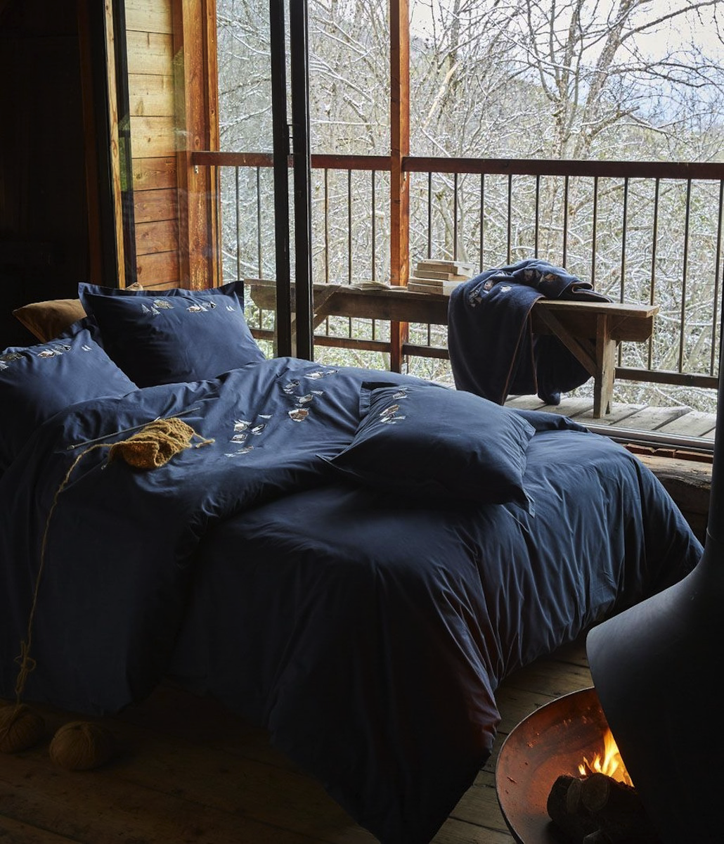 Sur cette housse de couette en percale de coton colorée dans un pierre bleu profond, les chalets sont brodés et déclinent différentes couleurs de bois, noisette, caramel, beige ou brun.