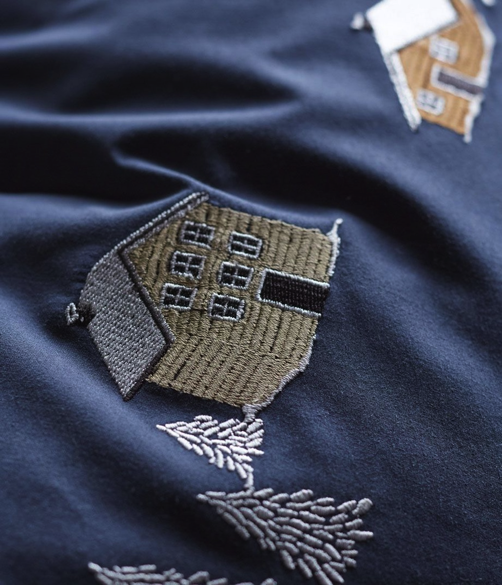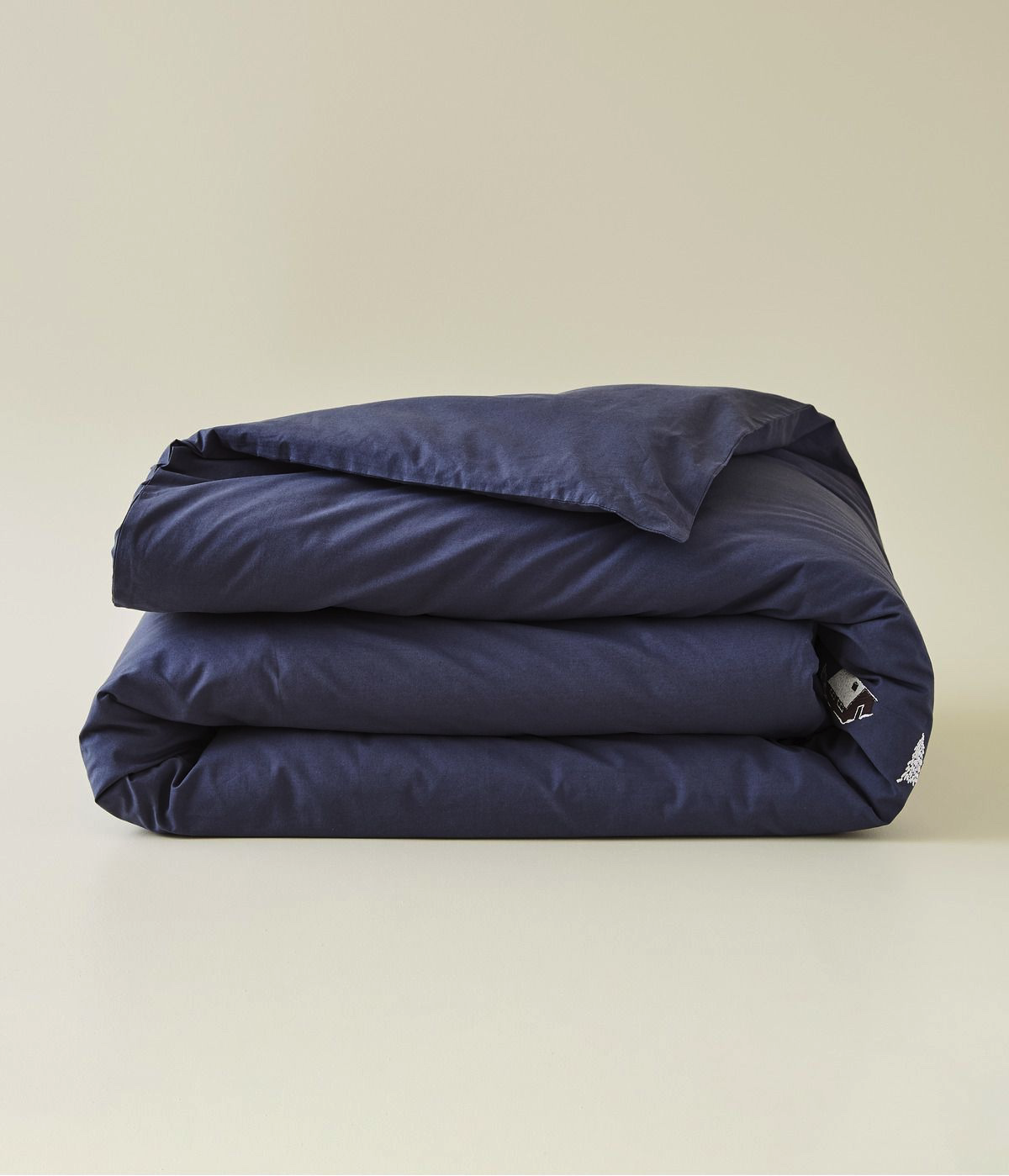 Sur cette housse de couette en percale de coton colorée dans un pierre bleu profond, les chalets sont brodés et déclinent différentes couleurs de bois, noisette, caramel, beige ou brun.