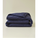 Sur cette housse de couette en percale de coton colorée dans un pierre bleu profond, les chalets sont brodés et déclinent différentes couleurs de bois, noisette, caramel, beige ou brun.