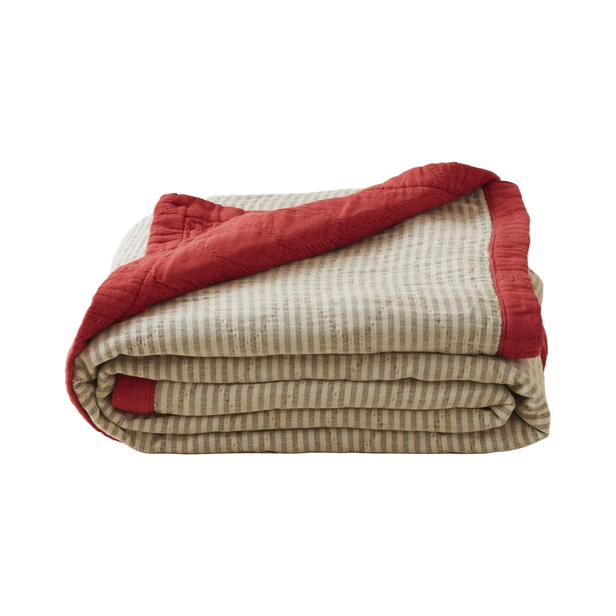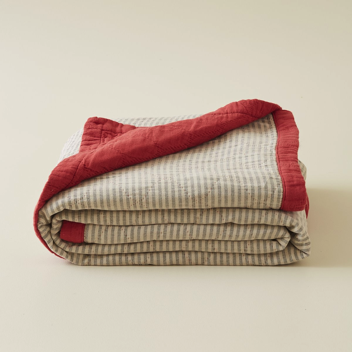 Jeté de lit en coton tissé-teint rayé gris et beige épeautre réversible en coton coloris paprika.