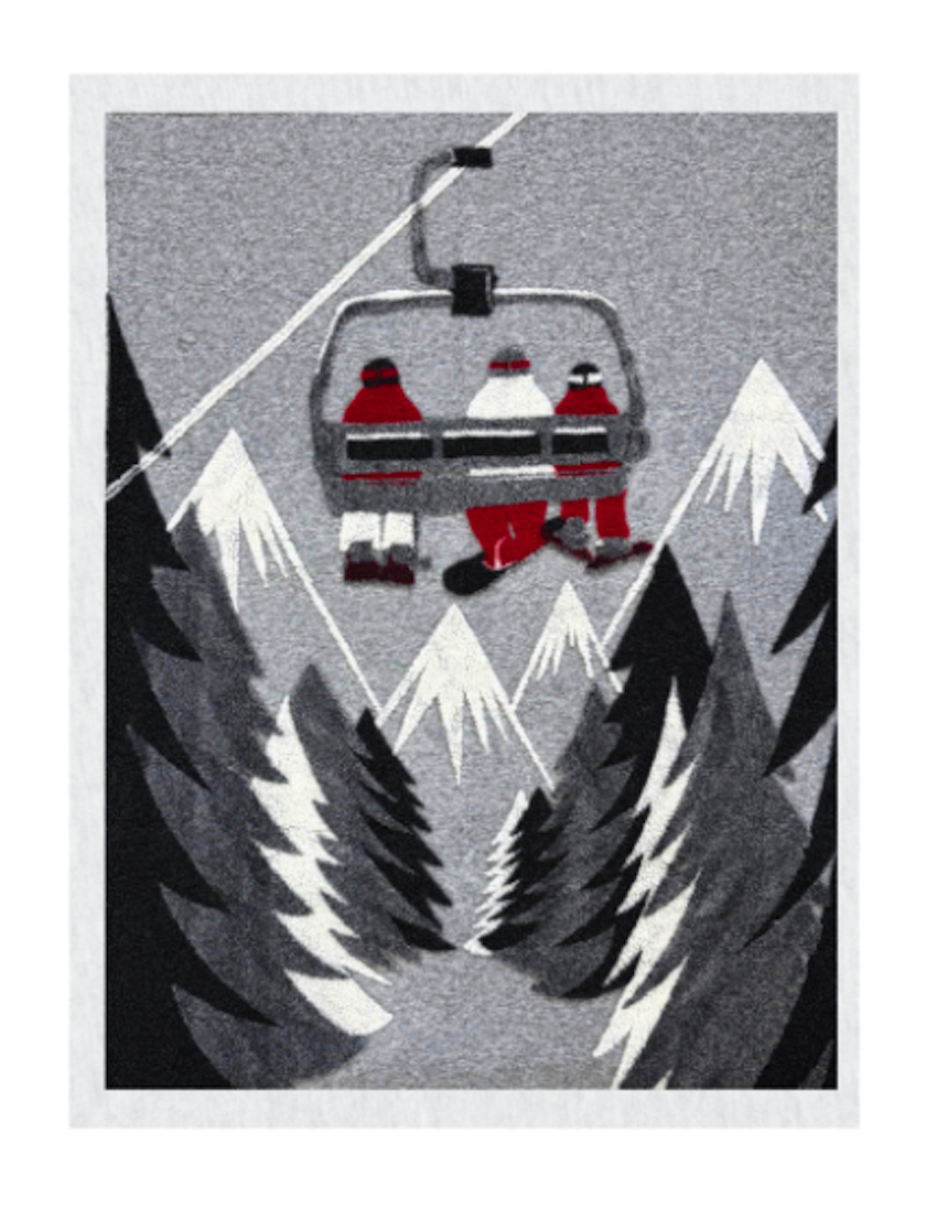 Plongez dans l’ambiance des stations de montagne avec ce magnifique plaid en laine gris, décoré d’un télésiège suspendu transportant des personnages vêtus de rouge au-dessus d’un paysage de sapins enneigés. Une scène hivernale pleine de charme qui évoque les jours de ski, les paysages alpins et la douce chaleur des chalets.