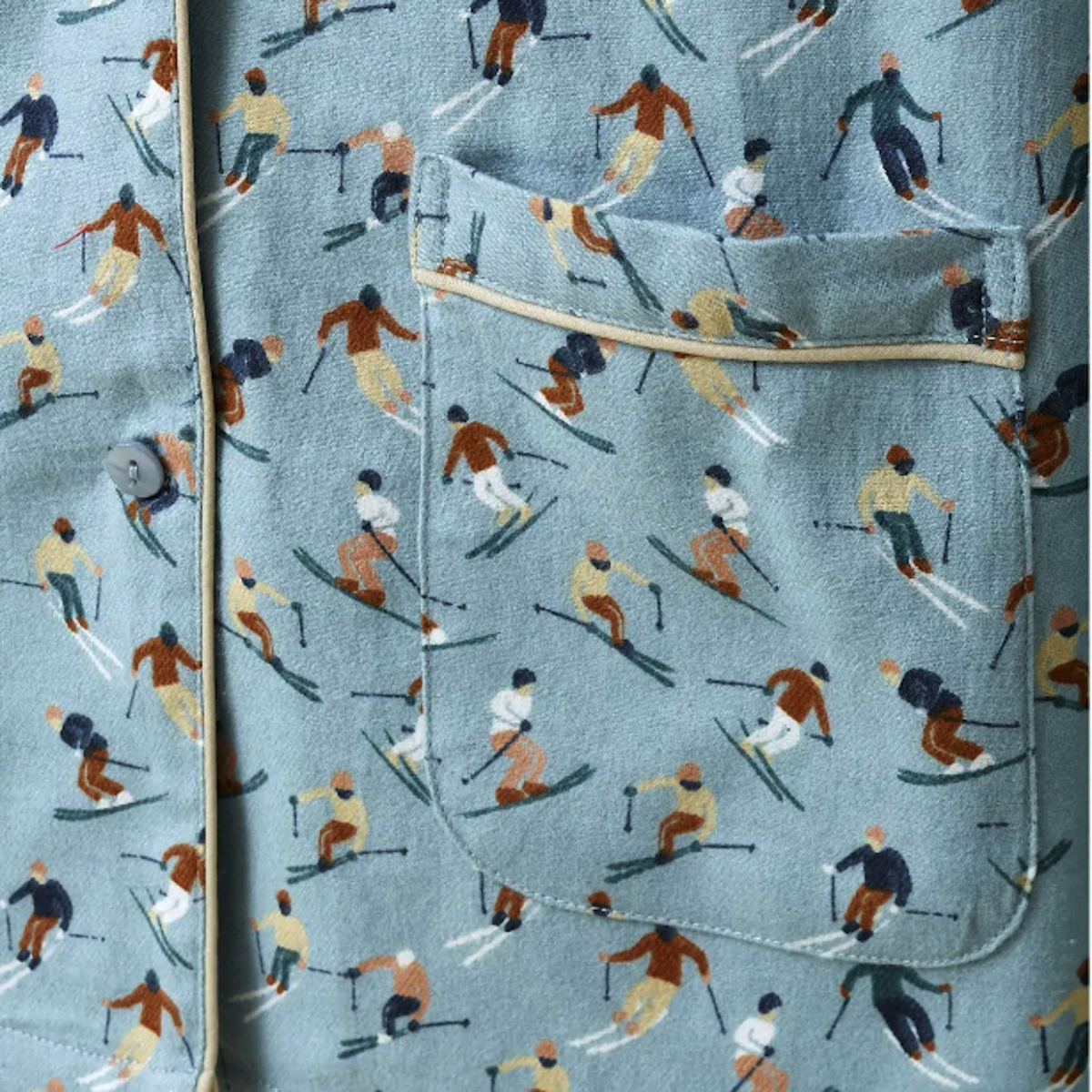 Sur ce pyjama adulte en flanelle doux et chaud, les silhouettes de skieurs dévalent les pentes dans un motif graphique inspiré des croquis rapides des illustrateurs.
