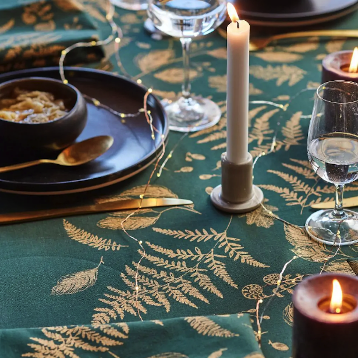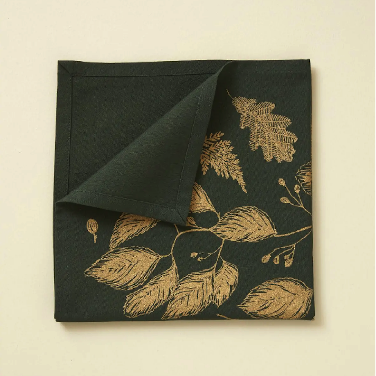 Sublimez votre table de Noël avec la serviette Forêt Enchantée de Sylvie Thiriez, véritable œuvre textile qui capture l'essence poétique des sous-bois en hiver. Son motif jacquard finement travaillé représente des feuillages et fougères dorés sur un fond vert profond, évoquant la beauté paisible d'une promenade en forêt à la lueur du crépuscule.