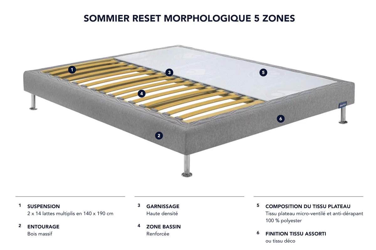 Découvrez le sommier Reset morphologique 5 zones confort souple de Bultex.Avec sa structure en pin massif, il intègre 2 barres de renfort centrales dès 100 cm, et 4 masses d’angles pour y fixer les pieds de lit.Il est composé de 2x14 lattes flexibles multiplis (en 140x190) et 2 lattes de renfort tête et pieds.Le reset comporte une zone d’épaules assouplie grâce à des lattes ajourées et une zone de bassin renforcée.Afin de procurer un très grand confort et un effet amortisseur inégalé, les lattes sont recouvertes d’une mousse de confort d’une épaisseur de 6 cm avec une densité de 25kg/m3.Il possède également un plateau micro-ventilé et anti-dérapant pour une meilleure aération du matelas et éviter le glissement de celui ci, et une toile de fond anti-poussière.Le sommier Reset est donc doté d’un confort moelleux. Ce sommier est disponible en de nombreuses finitions de tissus et dans toutes les dimensions standards sur commande. Au delà de 140cm de large, nous recommandons de prendre deux sommiers (80, 90 ou 100) pour une meilleure indépendance de couchage, plus de solidité (nombre de pieds doublé) et plus de facilité pour la livraison. Les sommiers sont reliés par une plaque d’assemblage. Le sommier est un élément très important dans le choix dune literie car il représente un tiers du soutien et du confort de votre literie et complètera parfaitement les propriétés de votre matelas, notamment ceux avec du ressorts. A associer avec les matelas de la gamme RESET. Caractéristiques :Hauteur 19 cmStructure Lattes multiplis, pin massifSuspension lattes flexiblesGarnissage mousse de confort 6 cmPlateau micro-ventilé et anti-dérapantFinition plate-bande piquée assortie au matelasCoutil 100% polyester logotypé BultexEntourage en bois massif.Vendu sans pieds.Encastrable dans un cadre de lit.Sommier tapissier garanti 5 ans et 7 ans si acheté en couple avec son matelas.Fabrication Française.