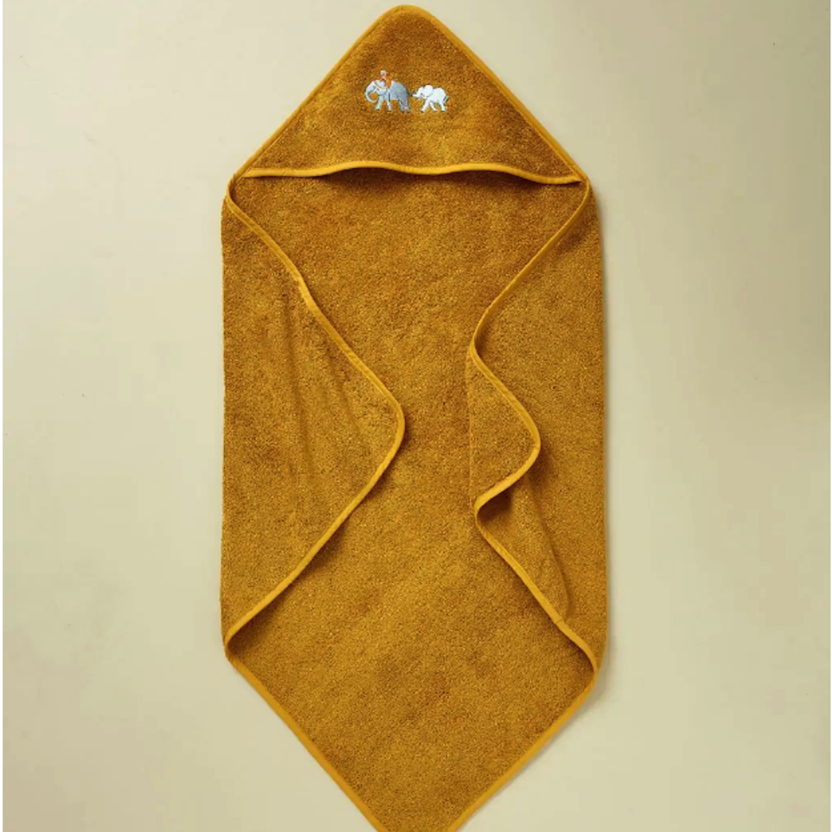 Disponible en un doux coloris safran, ce gant de toilette est ornée d'une broderie délicate d'éléphants, apportant une touche ludique et apaisante à la parure.