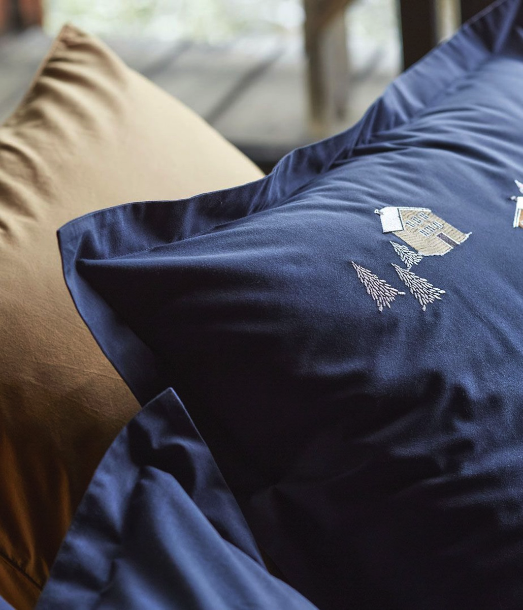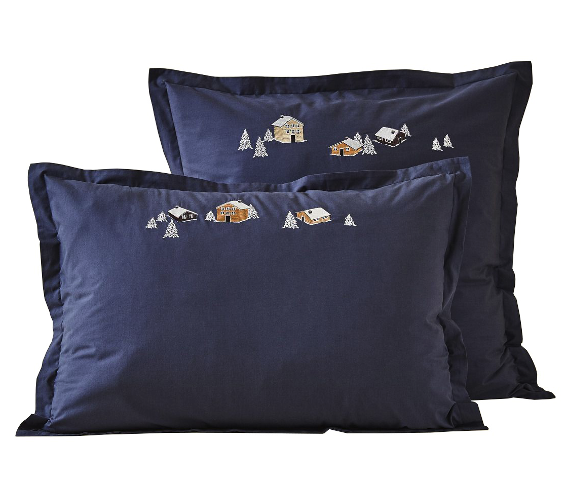 Sur une percale de coton colorée dans un pierre bleu profond, les chalets sont brodés et déclinent différentes couleurs de bois, noisette, caramel, beige ou brun.