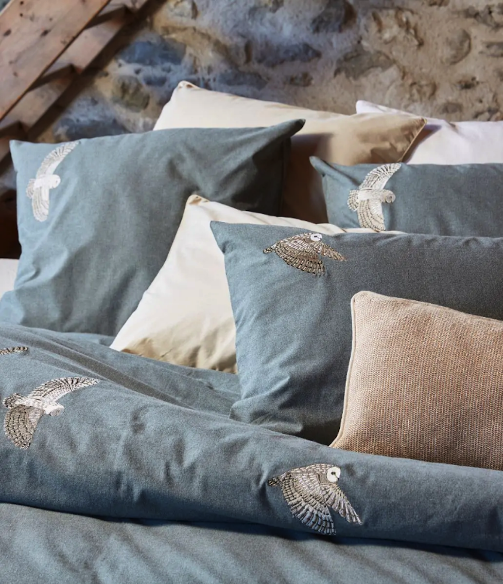 Nous y avons brodé d’élégantes chouettes effraies aux couleurs beiges et écru, mises en valeur par le fond coloris vert sauge.