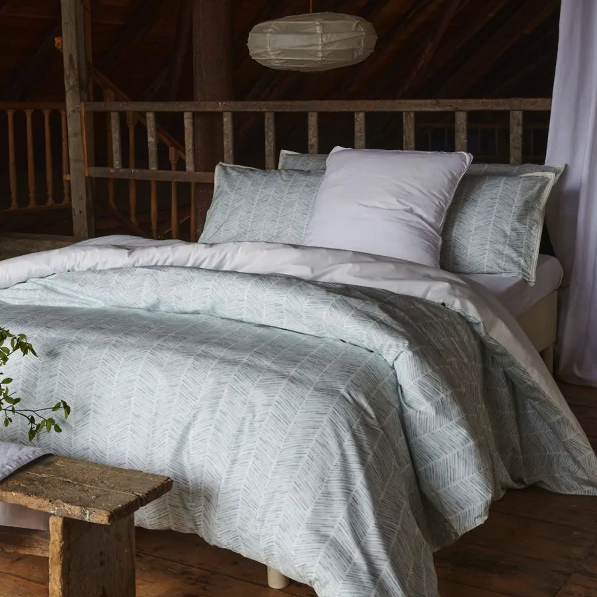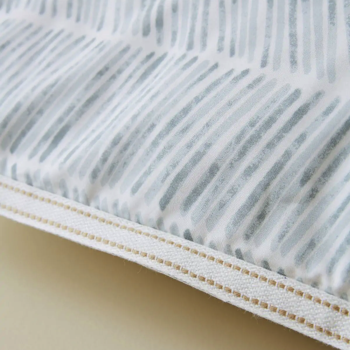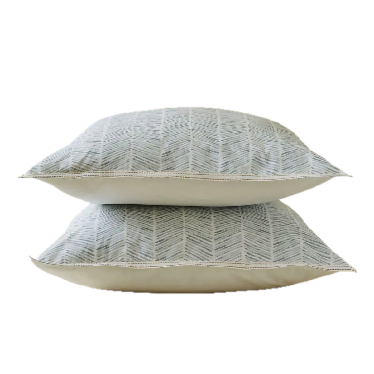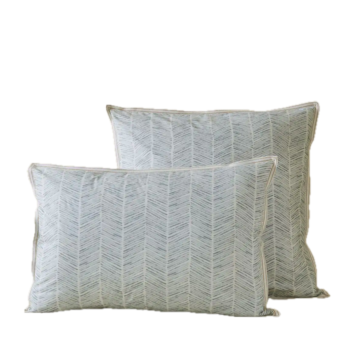 Les effets d’aquarelle insufflent au chevron des nuances subtiles et donnent à la parure une douceur moderne. Un galon tissé encadre les taies, soulignant l'authenticité de cette création.
