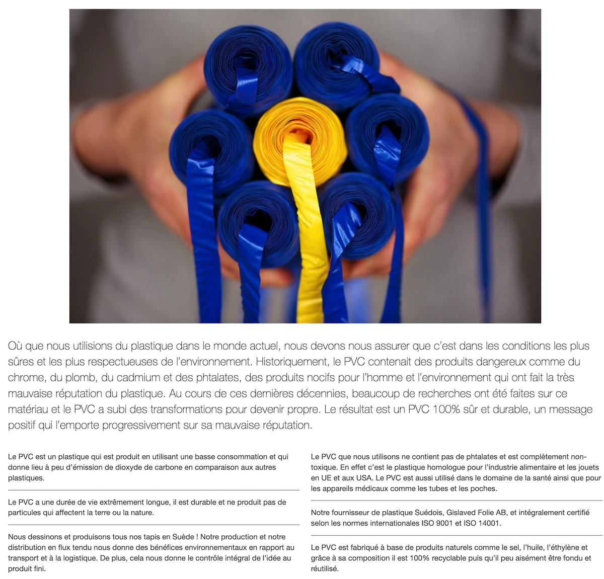 SVEA, la star intemporelle séduisant les cœurs par son aspect chatoyant et discret.Ce tapis, qui ajoute une touche d’élégance et d’allure à n’importe quelle pièce, est devenu un véritable classique. La polyvalence de SVEA lui permet d’être utilisé aussi bien à l’intérieur qu’à l’extérieur. Vous pouvez ainsi le placer sans difficulté dans n’importe quel endroit de votre maison. Son design sobre et sa palette de couleurs neutres lui permettent de s’intégrer facilement aux meubles et accessoires existants en se fondant parfaitement dans votre décor. SVEA est le fruit d’un savoir-faire exquis et d’un style durable. Le motif chatoyant et délicatement tissé crée une texture visuellement agréable qui ajoute de la profondeur et du caractère à votre intérieur. Grâce à sa technique de tissage durable, SVEA est conçu pour résister à l’épreuve du temps et vous garantir des années de plaisir et de beauté.Tapis en plastique pour une utilisation intérieure et extérieure, fabriqué en Suède. Bords ourlés avec un logo cousu sur une extrémité. Le tapis est tissé de bandelettes en plastique sans phtalate fabriquées en Suède par Gislaved Folie AB sur un métier à tisser traditionnel. Facile à entretenir et à laver.Les mesures peuvent varier d’environ ±4 % en raison des diverses étapes par lesquelles passent les tapis durant la production. Epaisseur environ 10 mm.- De part sa taille, ne pas laver en machine.- Aspirez votre tapis régulièrement.- Pour enlever les tâches, utilisez un chiffon doux et humide ou une éponge. Ne pas frotter.- Nettoyez le tapis avec une serpillère, à la main dans une baignoire/large bassine. Autrement nettoyez à sec.- Étirez uniformément les bords du tapis mouillé.- Lorsque vous le faites sécher, merci de l’étendre sur une barre large ou sur plusieurs fils.- Rincez le Ketchup immédiatement, ne frottez pas.Un tapis de Pappelina est tissé en rubans plastiques fabriqués en Suède. Les tapis en PVC ne contiennent ni phtalates ni substances nocives. Pappelina le garantit en utilisant uniquement une matière première plastique suédoise de Gislaved Folie AB, qui est certifié selon la norme ISO 9001 et ISO 14001.Le plastique est approuvé pour être utilisé dans l’industrie alimentaire et pour la fabrication de jouets en UE et aux États-Unis. Le PVC est un plastique qui peut être fondu et recyclé. Mais comme il n’est pas possible de garantir que le plastique recyclé est complètement non toxique, Pappelina préfère fabriquer ses tapis avec une matière première suédoise.
