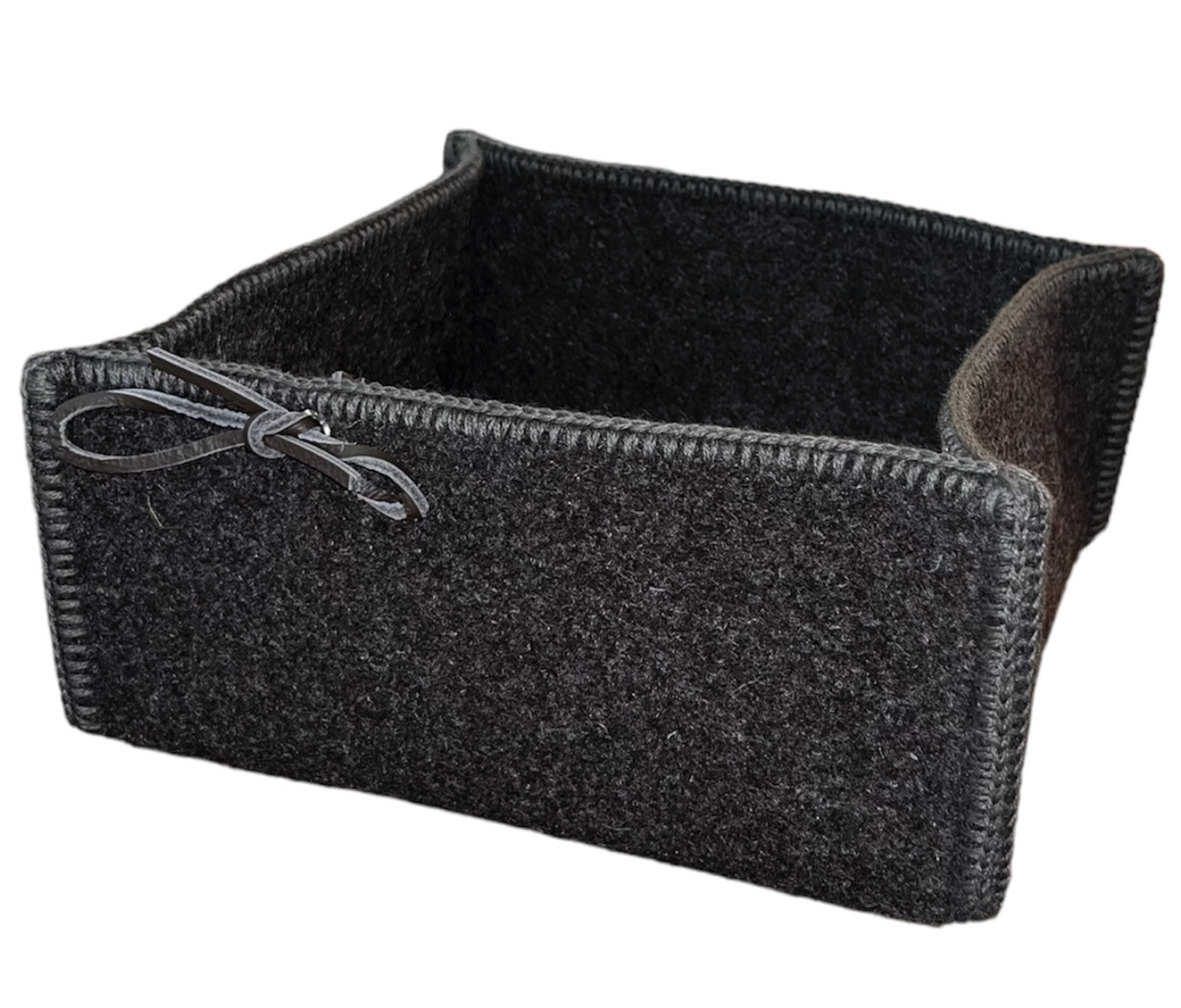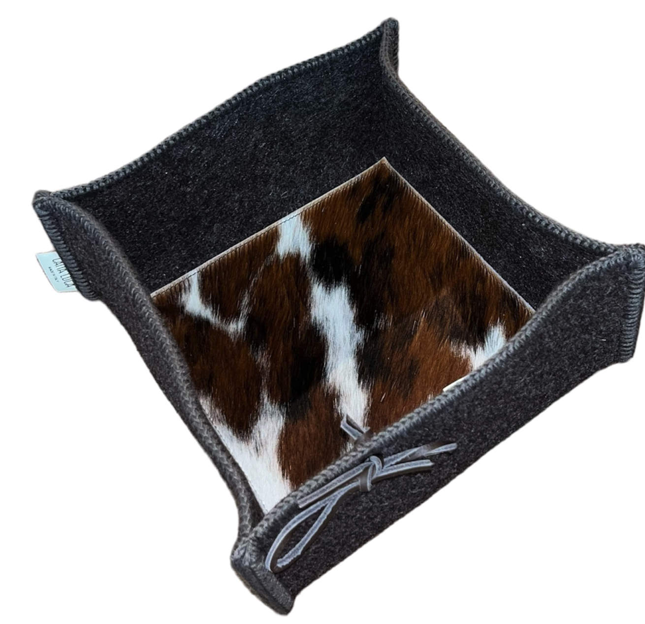 Cet élégant vide-poche est en feutre de laine naturelle et peau de vache par Catia Luca, il s'avérera très utile sur un meuble d'entrée, un buffet, un bureau ou une table basse.