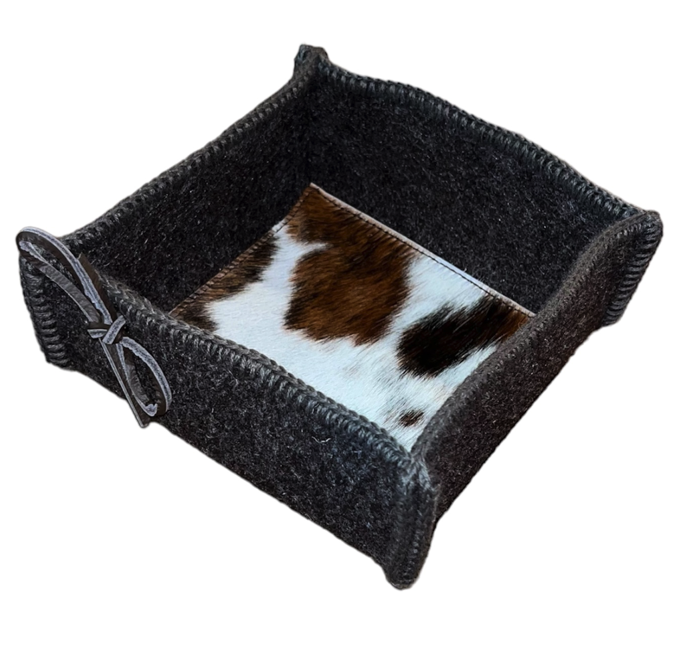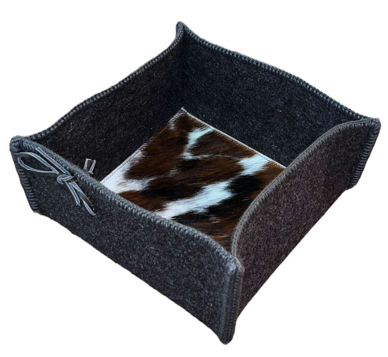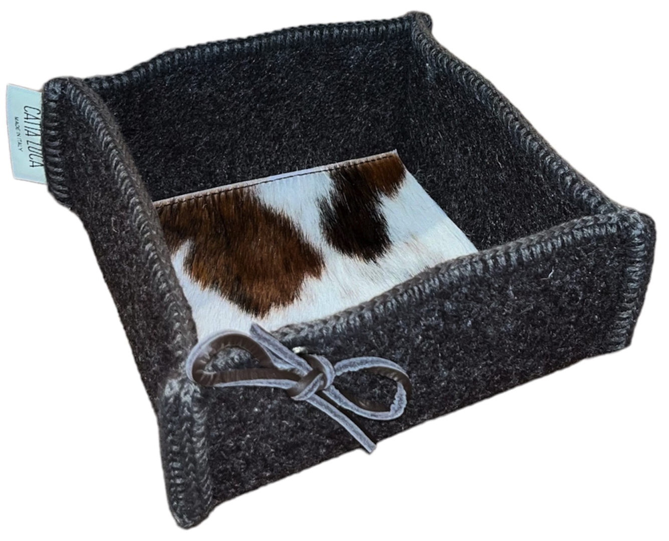 Cet élégant vide-poche est en feutre de laine naturelle et peau de vache par Catia Luca, il s'avérera très utile sur un meuble d'entrée, un buffet, un bureau ou une table basse.